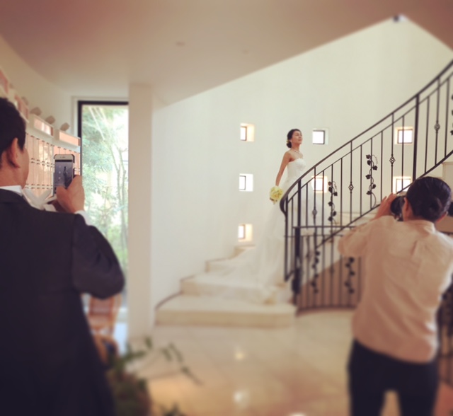 ベールの透け感、輝く白いドレス、スッとした立ち姿。