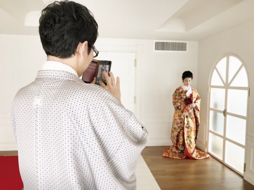 ご新婦さまのソロカットでは、真剣に撮影するご新郎さまを発見!