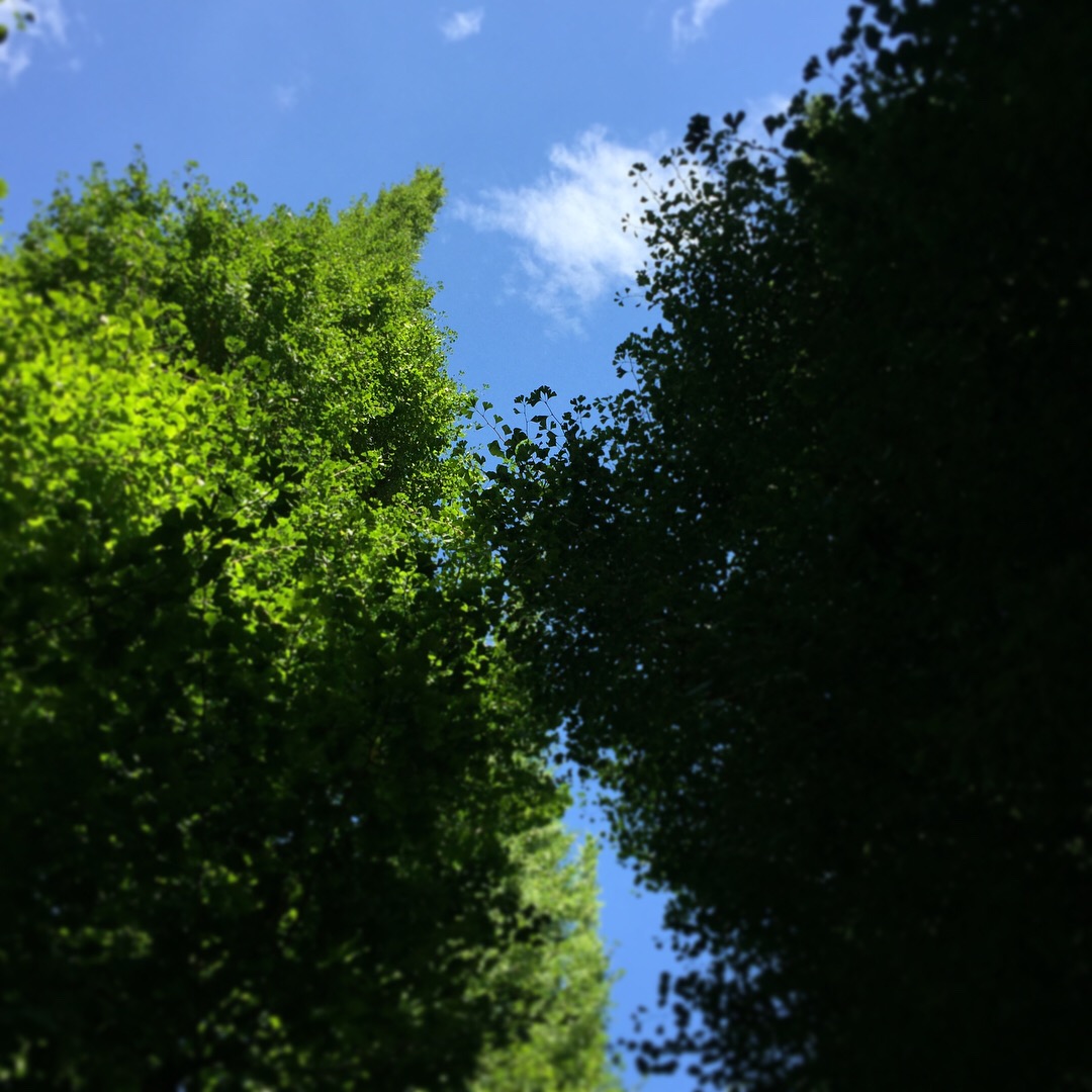 セミの声と青空と、緑の銀杏並木。