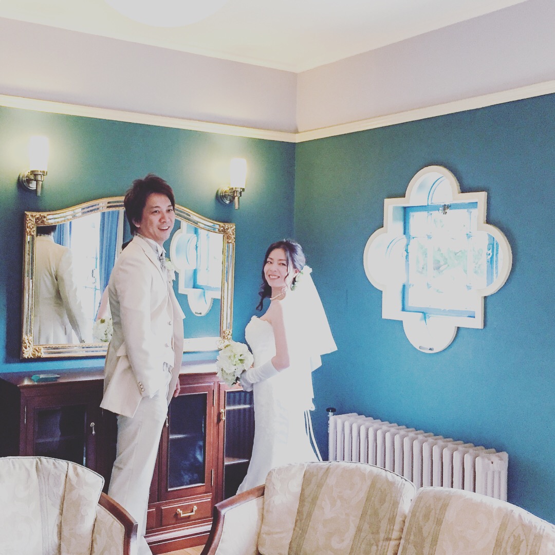 とても可愛い横浜西洋館・ベーリックホールにて 『写真だけの結婚式』撮影させていただきました。 広いホールに長いトレーンがよく映える! マーメイドドレスがとてもお似合いのご新婦さま。ベーリックホールと言えば、こちらの青壁! とてもステキな飾り窓と一緒にパチリ☆ 背の高いご新郎さま、向かい合うだけでも絵になるのです♪