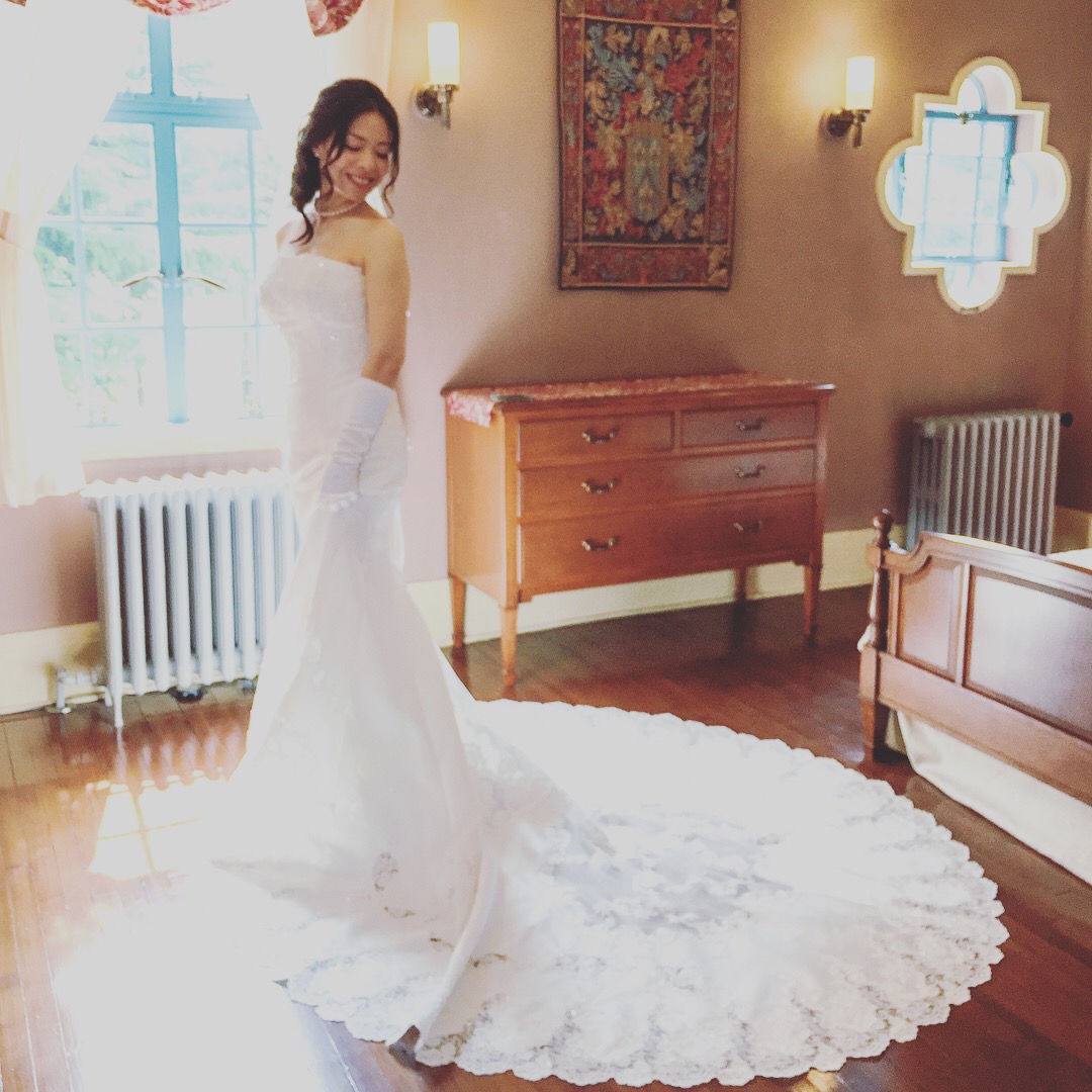 こちらのお部屋は夫人寝室だったそうで、 ならば!やはり!ご新婦さまソロカット! クールビューティなご新婦さま、腰をひねって頑張っていただきました! 本当にお美しい~!!